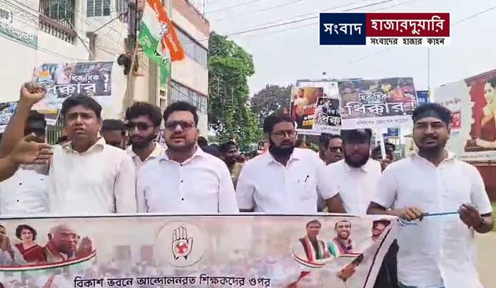 সংবাদ হাজারদুয়ারি ওয়েবডেস্কঃ ছাত্র পরিষদকে সঙ্গে নিয়ে বহরমপুরে পথে নামল মুর্শিদাবাদ জেলা যুব কংগ্রেস। চাকরিহারা শিক্ষকদের ওপর পুলিশের লাঠিচার্জ, ভারতীয় সেনাবাহিনীর কর্ণেল সোফিয়া কুরেশিকে নিয়ে বিজেপি নেতার কু-মন্তব্যের প্রতিবাদ ও বিহারে রাহুল গান্ধীকে হেনস্থা, এই তিনটি ইস্যূকে সামনে রেখে বহরমপুরে যুবদের একটি প্রতিবাদ মিছিল শহর পরিক্রমা করে। যুব কংগ্রেসের জেলা সভাপতি তৌহিদুর রহমান ওরফে সুমনের নেতৃত্বে সংগঠনের জনা কয়েক প্রতিনিধি বহরমপুর থানায় মধ্যপ্রদেশের মন্ত্রী বিজয় শাহের বিরুদ্ধে অভিযোগ দায়ের করে।
