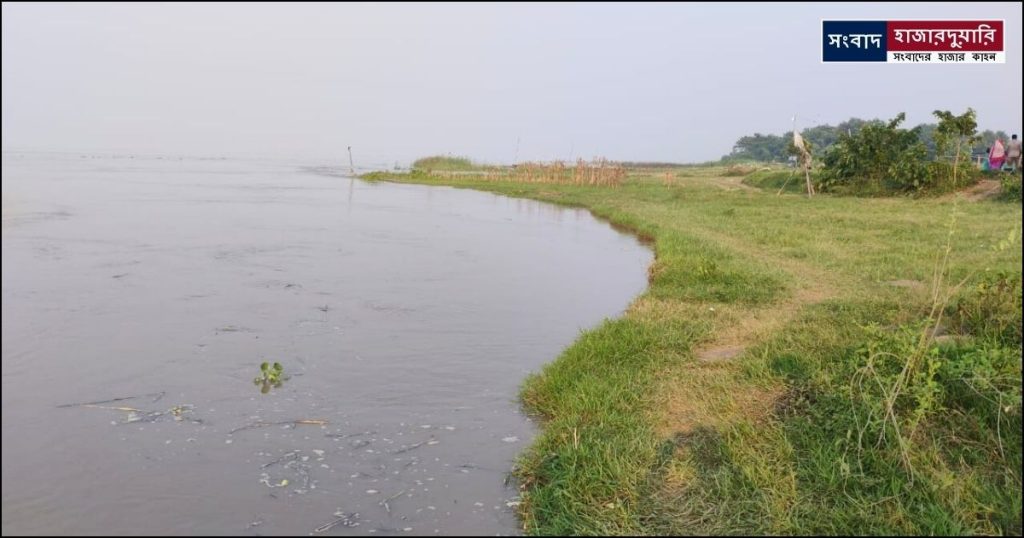 দিন কয়েকের এই ভাঙনে পার লাগোয়া বেশ কিছু গাছ ভেঙে গিয়েছে। আর একটু এগিয়ে বিএসএফ চেক পয়েন্টের দিকে এগিয়ে গেলে নিচু জায়গায় পদ্মার পার মিশে গিয়েছে জমির সঙ্গে। আতঙ্কিত জিয়াউল বললেন, “আরও জল বাড়লে এই দিকের আরও কয়েকশো বিঘে জমি জলের তলায় চলে যাবে।”