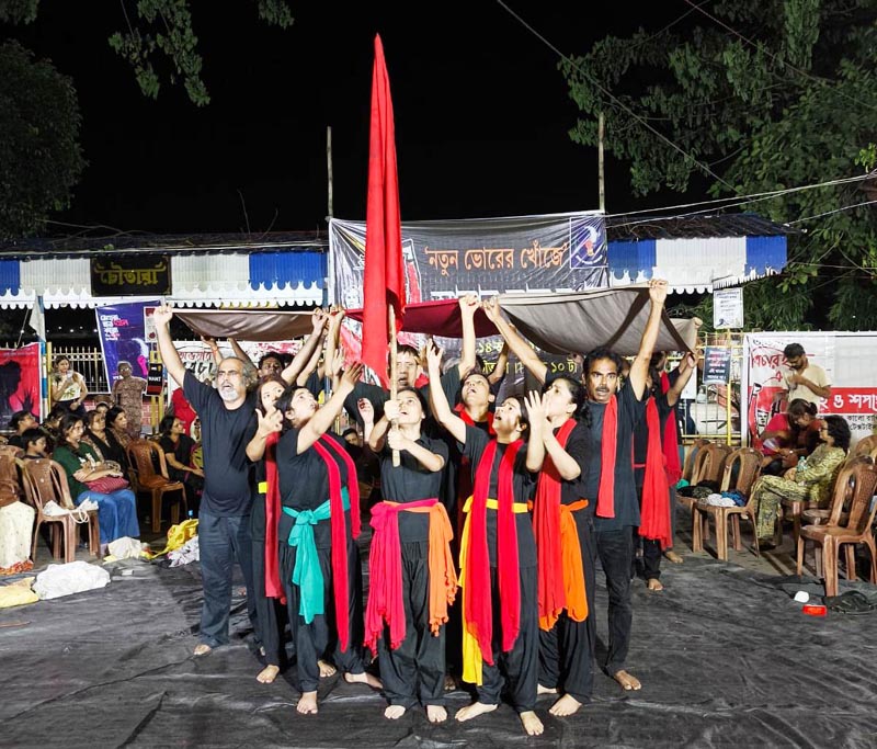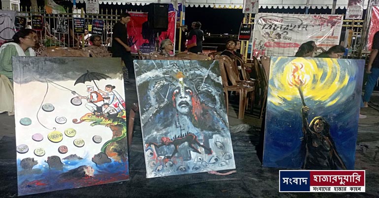 সংবাদ হাজারদুয়ারি ওয়েবডেস্কঃ কোনও রাজনৈতিক দলের পতাকা ছাড়াই ১৪ অগস্ট বহরমপুর শহরে রাত জাগলেন সাংস্কৃতিক কর্মীরা। বছর পেরিয়ে গিয়েছে, আরজিকর হাসপাতালে কর্তব্যরত চিকিৎসক হত্যার আজও বিচার হয়নি। মেয়েরা সমাজে আজও নিরাপত্তাহীন। ছবি আঁকা, গান, নাচ, নাটক আবৃত্তিকে হাতিয়ার করে তারই প্রতিবাদ করলেন শিল্পী, অভিনেতারা। বহরমপুর টেক্সটাইল কলেজ সংলগ্ন ‘চৌতারা’র সামনের মঞ্চ হয়ে উঠেছিল প্রতিবাদী মঞ্চ।
