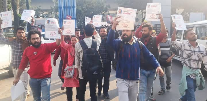 সংবাদ হাজারদুয়ারি ওয়েবডেস্কঃ বাংলায় শিক্ষক নিয়োগ নেই, স্কুলে কলেজে অনিয়ন্ত্রীত ফি নেওয়া, মিড মে মিলে দুর্নীতি সহ দশটি বিষয়ে শিক্ষামন্ত্রীকে একের মধ্যে শূন্য সর্বমোট দশে শূন্যের বেশি দিতে পারেনি ভারতের ছাত্র ফেডারেশন বা এসএফআই। সেই মার্কশীট হাতে সপ্তাহের প্রথম কাজের দিন বিকাশ ভবন অভিযানের ডাক দেওয়া হয়েছিল সংগঠনের পক্ষ থেকে। সেইমতো করুনাময়ীর সামনে ভিড় করেন এসএফআই কর্মী সমর্থকরা।