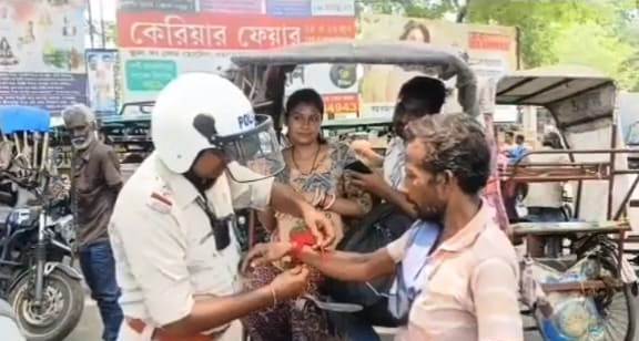 সেই ‘রাগী’ পুলিশ রাখি পুর্ণিমার দিন যেন অন্য পুলিশ। সেই রাগ, সেই শাসন গলে উধাও। অগুণতি টোটোর মাঝখানে হাতে গোনা কয়েকটি রিক্সার এখনও দেখা মেলে বহরমপুর স্টেশনে। মনোজ সেই হাতে গোনা বয়স্ক রিক্সা চালকের হাতে রাখি পড়িয়ে মিষ্টি মুখ করালেন তাঁদের। হাতে তুলে দিলেন নতুন পোশাক। বয়সের ভারে নুব্জ সেই মানুষগুলোকে শেষ কে কবে আদর করে ডেকেছে, আজ আর তাঁদের মনে নেই। বয়স্ক পা দুটোতে প্যাডেল ঠেলে টোটোর ভিড়ে আজও তাঁরা ছুটছেন দু’টো পয়সা রোজগারের আশায়। এদিন মনোজের দেওয়া উপহারে তাঁদের কারও কারও চোখের কোণা ভিজে গিয়েছিল আনন্দে। এই পুলিশ কি সেই পুলিশ। ধন্দে পড়ে কেউ কেউ তাঁর হাত দুটো ছুঁয়ে দেখলেন। পুলিশের এমন কান্ড দেখে মনোজের হাতে পাল্টা রাখি পড়িয়ে শুভেচ্ছা জানিয়ে এক রিক্সাযাত্রী বললেন “রাখি পূর্ণিমার এও এক অন্য উদযাপন।” আর মনোজ ? বুলেট ঘুরিয়ে এগিয়ে গেলেন যানের জট ছাড়াতে।