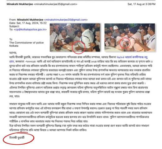 সেই দাবি জানিয়ে মীনাক্ষী গোয়েলকে লিখেছিলেন ” এরপর সন্ধ্যা ৭:৩০ নাগাদ আরজি কর হাসপাতালের মর্গ থেকে পুলিশ মৃতদেহ নিয়ে তড়িঘড়ি বেরিয়ে যাওয়ার চেষ্টা করলে আমরা পুলিশকে জানাই যে নিহতের পবিবারের লোকের সাথে আমরা কথা বলতে চাই এবং জানতে চাই যে পুলিশের কেউ তাদের উপর প্রশাসনিক প্রভাব খাটাবার চেষ্টা করছে কিনা। নিরপেক্ষ তদন্ত সুনিশ্চিত করার ক্ষেত্রে এই ধরণের কোনো প্রকার প্রভাব মুক্ত রাখা জরুরি। এইসময় উপস্থিত পুলিশের একাংশ অভিষেক গুপ্তার নেতৃত্ব কোনোরকম মহিলা পুলিশের অনুপস্থিতিতে আইন শৃঙ্খলা রক্ষার নামে বিনা প্ররোচনায় সচেতনভাবে ও ইচ্ছাকৃতভাবে আমার বুকে ধাক্কা মারে, কয়েকটি সজোরে ঘুষি চালায়, মহিলা পুলিশ ছাড়াই বহু সংখ্যক পুরুষ পুলিশ আমাদের ধাক্কা দেয়, মারে।” সমাজমাধ্যমে সেই ছবি ইতিমধ্যে ভাইরাল হয়েছে।