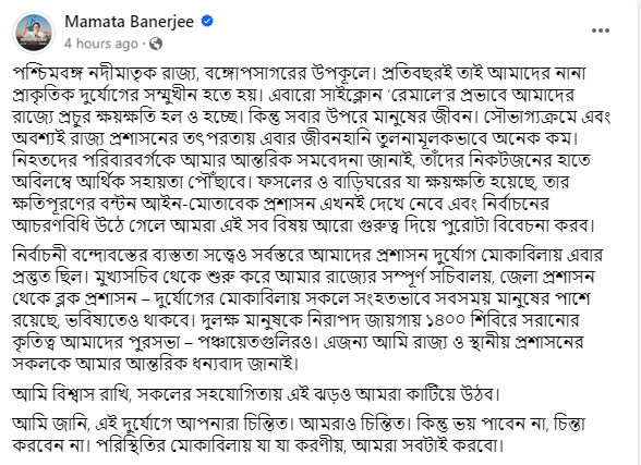 নিজের ফেসবুক হ্যান্ডেলে মুখ্যমন্ত্রী মমতা বন্দ্যোপাধ্যায় লিখেছেন, “…সাইক্লোন ‘রেমালে’র প্রভাবে আমাদের রাজ্যে প্রচুর ক্ষয়ক্ষতি হল ও হচ্ছে। কিন্তু সবার উপরে মানুষের জীবন। সৌভাগ্যক্রমে এবং অবশ্যই রাজ্য প্রশাসনের তৎপরতায় এবার জীবনহানি তুলনামূলকভাবে অনেক কম। নিহতদের পরিবারবর্গকে আমার আন্তরিক সমবেদনা জানাই, তাঁদের নিকটজনের হাতে অবিলম্বে আর্থিক সহায়তা পৌঁছাবে।” রাজ্যবাসীকে ভরসা দিয়ে আরও লিখেছেন, “‘আমি বিশ্বাস রাখি, সকলের সহযোগিতায় এই ঝড়ও আমরা কাটিয়ে উঠব। আমি জানি, এই দুর্যোগে আপনারা চিন্তিত। আমরাও চিন্তিত। কিন্তু ভয় পাবেন না, চিন্তা করবেন না।”