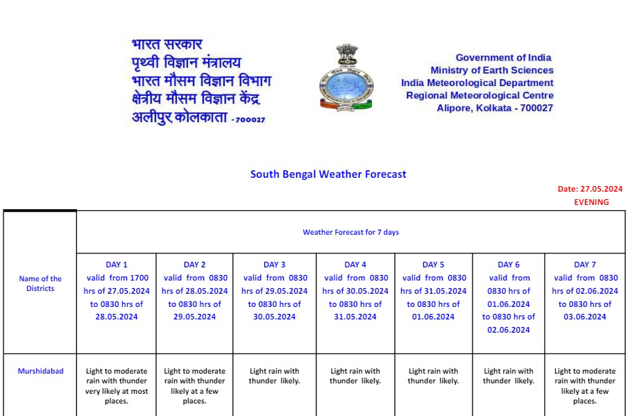 সংবাদ প্রতিনিধি, মুর্শিদাবাদঃ রেমাল প্রভাবে সোমবার দিনভর ভিজল মুর্শিদাবাদ। সোমবার ভোর থেকে সন্ধ্যা পর্যন্ত জেলায় কখনও হালকা কখনও ভারি বৃষ্টি হয়েছে। কোথাও আবার ছিটেফোঁটা বৃষ্টি হয়েছে । উপ কৃষি অধিকর্তা (প্রশাসন) মোহনলাল কুমার বলেন, “মুর্শিদাবাদ জেলায় সকাল সাতটা পর্যন্ত ১৫.৬ মিমি বৃষ্টিপাত হয়েছে। সবচেয়ে বেশি ৪৩.৬ মিমি বৃষ্টিপাত হয়েছে বহরমপুরে। সবচেয়ে কম ৫ মিমি বৃষ্টিপাত হয়েছে শমসেরগঞ্জে।” যদিও এই বৃষ্টিতে ফসলের কোনও ক্ষতি হয়নি বলে জানান তিনি।