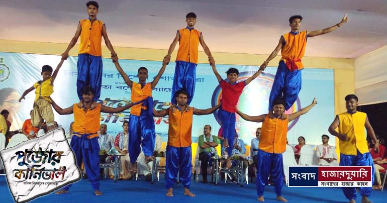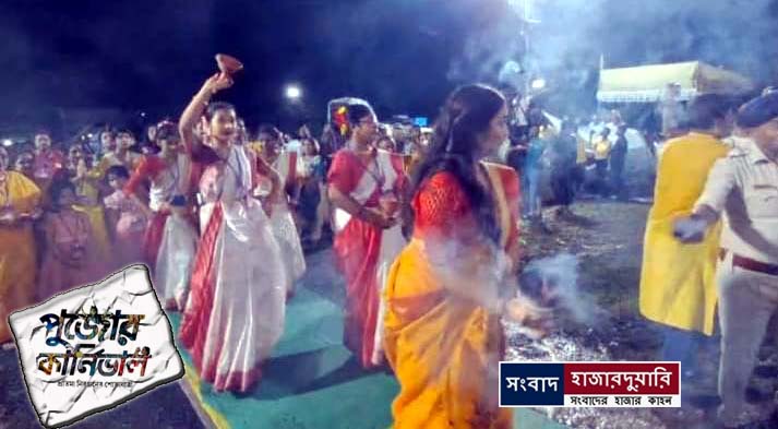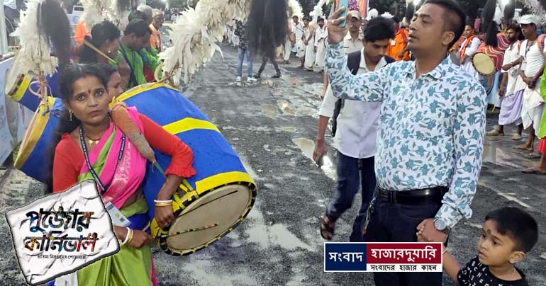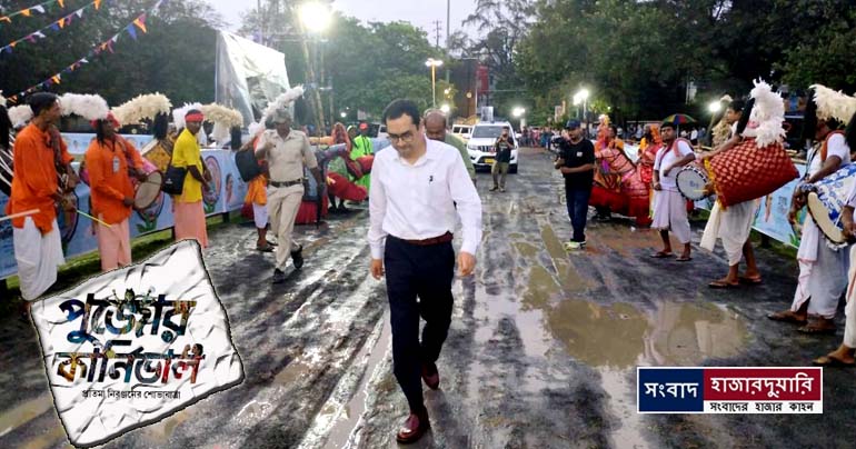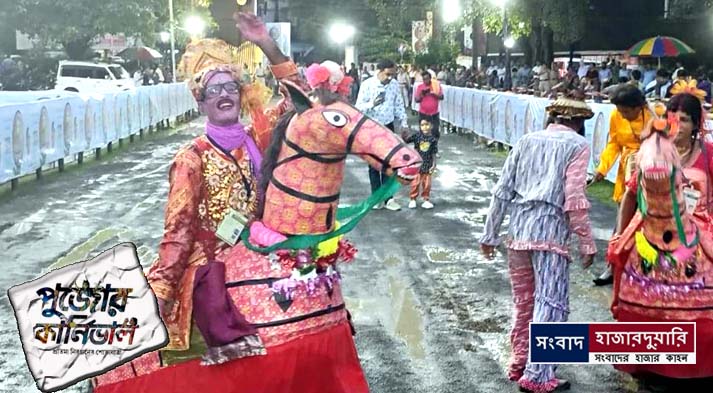সংবাদ হাজারদুয়ারি ওয়েবডেস্কঃ বহরমপুরের ওয়াইএমএ মাঠে শনিবার হয়ে গেল চলতি বছরের পুজা কার্নিভাল। দশটি পুজো কমিটি এবার এই কার্নিভালে অংশ নিয়েছিল। যদিও বিসর্জনের এই বিশেষ শোভা যাত্রার আনন্দ মাটি করেছে মুষলধারে বৃষ্টি। অনুষ্ঠান উতরোনো নিয়ে কার্যত চিন্তায় পড়ে গিয়েছিলেন প্রশাসনের শীর্ষ কর্তারা। বিকেল চারটের সময় শোভাযাত্রা শুরু হওয়ার কথা থাকলেও বৃষ্টির কারণে তা প্রায় এক ঘন্টা পিছিয়ে যায়। অন্যবছর এই মাঠেই বিসর্জনের শোভাযাত্রা দেখতে ভিড় করেন বহরমপুরের মানুষজন। কিন্তু এবার বৃষ্টির কারণে সেই শোভাযাত্রা দেখা থেকে বঞ্চিত হলেন তাঁরা।
