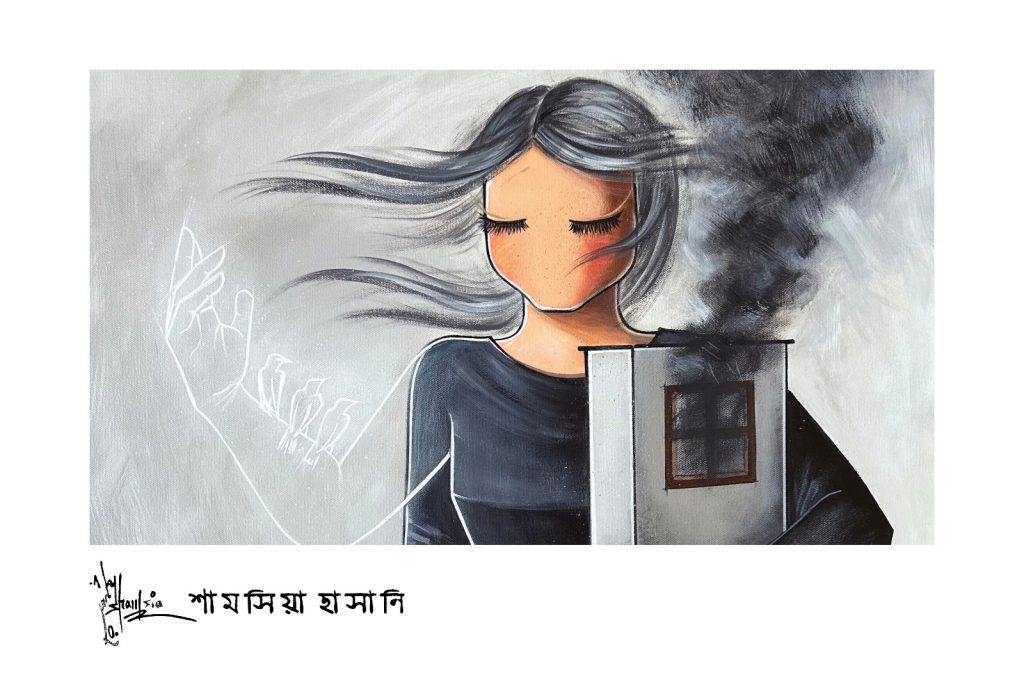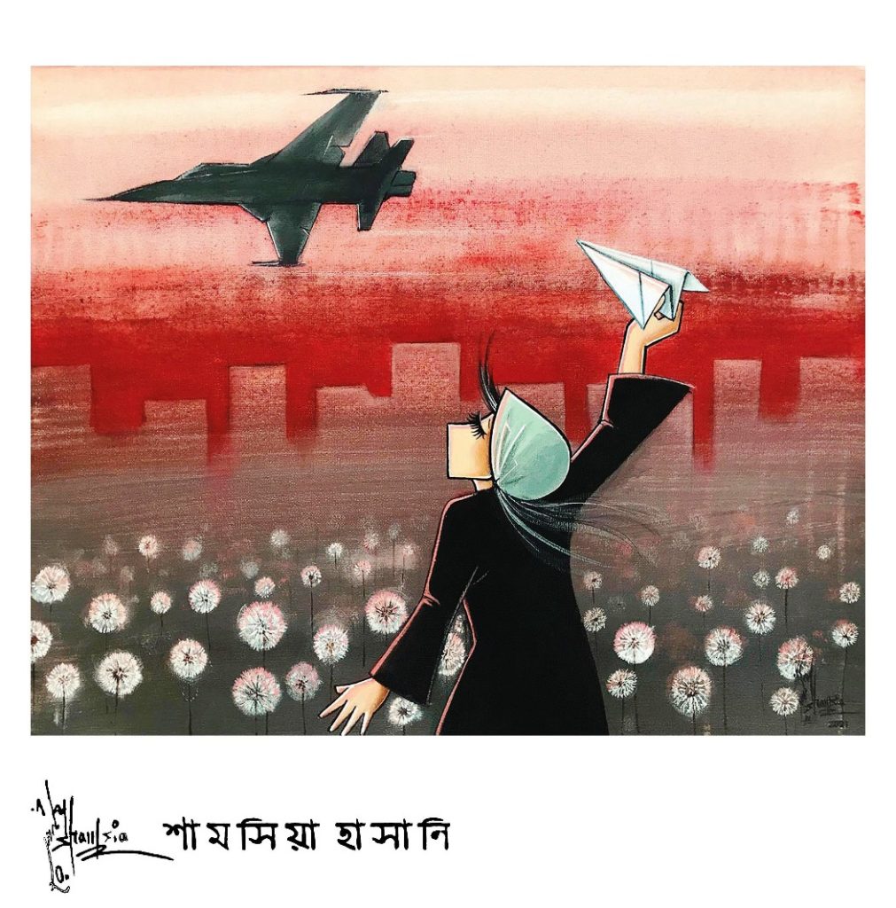 তাঁর ছবিতে কখনো দেখা যায় একটি মেয়ে তার বহু যত্নে লালন করা স্বপ্ন অথবা প্রতীকী ফুলসহ টব মাটিতে ফেলে দু’হাতে মুখ ঢেকে কাঁদছে। পিছনে নিরবচ্ছিন্ন ভীতির মতো দাঁড়িয়ে আছে— হাতে বন্দুক, জঙ্গিরূপী ধর্মীয় ছায়া-ফতোয়া। আরেকটি ছবিতে দেখা যাচ্ছে আকাশে পাকশাট খাওয়া যুদ্ধবিমানের দিকে একটি মেয়ে ছুঁড়ে মারতে চাইছে কাগজের তৈরি এরোপ্লেইন। ওই মুহূর্তে কাগজের এরোপ্লেইন আর কাগজের থাকছে না, হয়ে উঠছে সমগ্র পৃথিবীর একটি সম্মিলিত আওয়াজ— সেই আওয়াজ যেন বলতে চাইছে, বন্ধ করো তোমাদের এইসব বিধ্বংসী আস্ফালন, সৃষ্টির ধ্বজা ধরো। তবে শুনলে তো? যুদ্ধবাজ একনায়ক, কট্টর মৌলবাদ, ধর্মীয় জঙ্গিপনা— এরা কখনো ফুল-পাতা-ঘাস, রঙ-তুলি-সুর, শিশু-প্রাণের জন্মকথা শুনতে পায় না, এরা জন্ম-বধির। ধ্বংসেই এদের যাবতীয় সুখ!