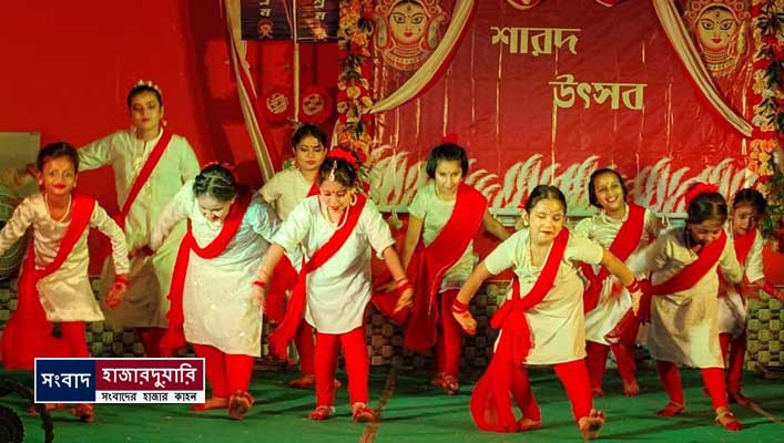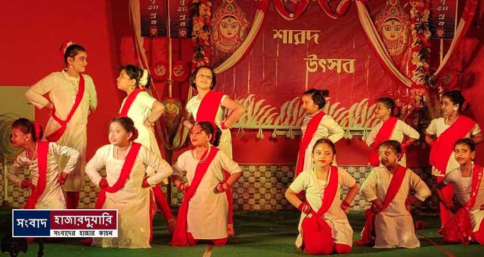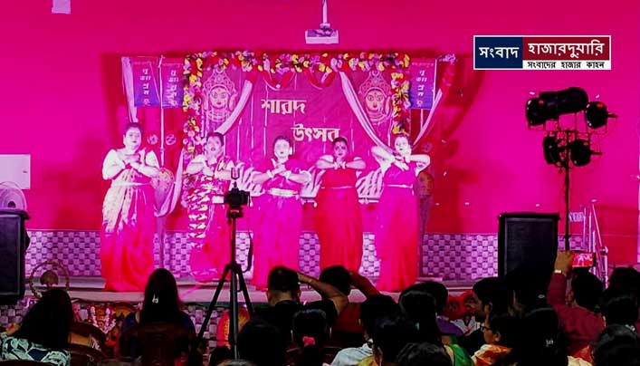সংবাদ হাজারদুয়ারি ওয়েবডেস্কঃ চতুর্থীর সন্ধ্যায় নাচ, গান, কবিতার ডালি সাজিয়ে শহরবাসীকে শারদ অর্ঘ্য উপহার দিল নৃত্যাশ্রম। বহরমপুরের এই নৃত্য সংস্থা প্রতিবছরই পুজো শুরুর সময় এই ধরনের উৎসবের আয়োজন করে। এ বছরেও তার ব্যতিক্রম হয়নি। চলতি বছর মুর্শিদাবাদ বিশ্ববিদ্যালয়ের পিজি ক্যাম্পাসের (সাবেক কেএনকলেজের মেইন হস্টেল) অডিটোরিয়ামে এই অনুষ্ঠান অনুষ্ঠিত হয়।