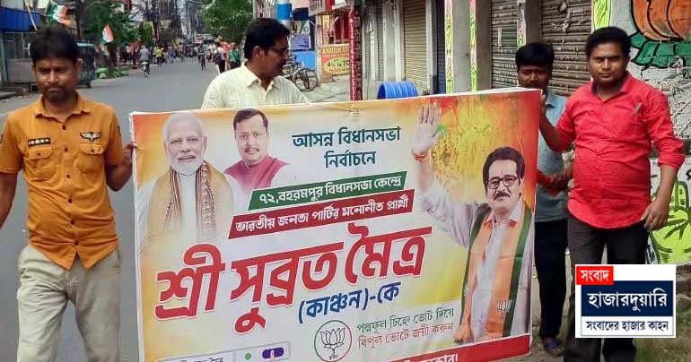 আর এখানে এসে মানুষকে যেন ছায়া দিলেন বহরমপুরের বিজেপি প্রার্থী সুব্রত ওরফে কাঞ্চন। ভোট মিটে গিয়েছে। ভোট পর্বে প্রার্থীর প্রচারের জন্য লাগানো হয়েছিল ফ্লেক্স, দলীয় পতাকা। এখনও শহরের এ প্রান্ত থেকে ওপ্রান্ত ঢাউস হোডিংয়ে মুখে ঢেকেছে আকাশের। যদিও শহর জুড়ে বারোমাস দুলতে থাকে বিভিন্ন রাজনৈতিক দলের পতাকা। দৃশ্য দূষণ হয়। মুখ ঢেকে যায় মনিষীদের। হেলদোল থাকে না সংস্কৃতির শহরের ঠিকা নেওয়া নেতাদের।