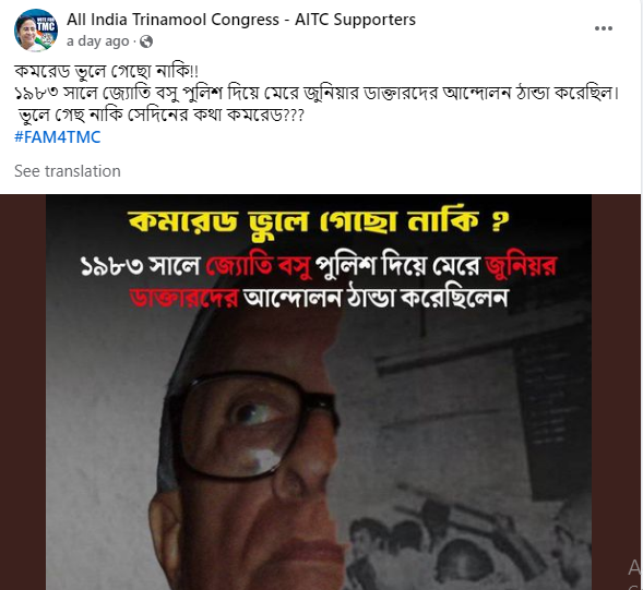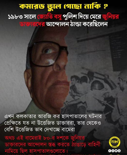 তবে যত রাত বাড়ছে লালবাজার অঞ্চলে পুলিশের সংখ্যা বাড়ছে। কলকাতা পুলিশ কমিশনার বিনীত গোয়েলের পদত্যাগ দাবি করে অবস্থান বিক্ষোভ করছেন চিকিৎসকরা। সেই বিক্ষোভ সামলাতে পুলিশ টিয়ার গ্যাস, লাঠি হাতে প্রস্তুতি নিচ্ছে। এই অবস্থায় তৃণমূলের সমর্থকরা উদাহরণ হিসেবে জ্যোতি বসুর আমল তুলে আনছেন সমাজমাধ্যমে। সেখানে একটি ছবি পোস্ট করে লেখা হয় ১৯৮৩ সালে জ্যোতি বসু পুলিশ দিয়ে মেরে জুনিয়র ডাক্তারদের আন্দোলন ঠান্ডা করেছিলেন। সেই পোস্টেই বামেদের জড়িয়ে লেখা হয়েছে জুনিয়র ডাক্তারদের তুলনায় বামেরা বেশি উত্তেজিত।